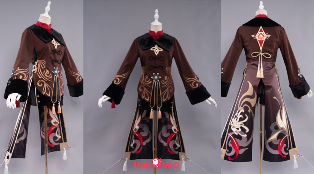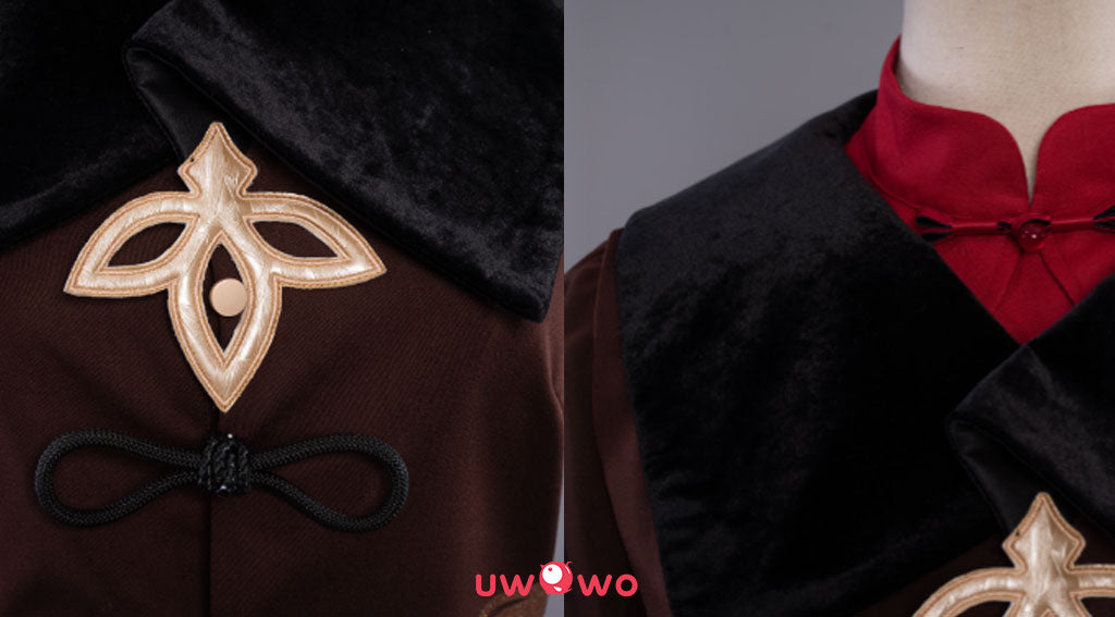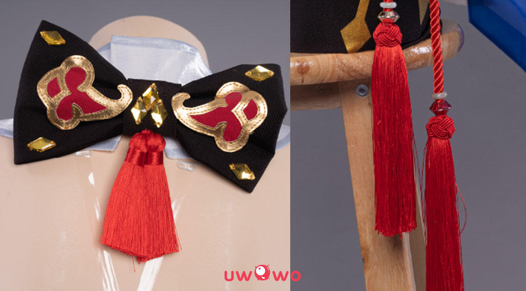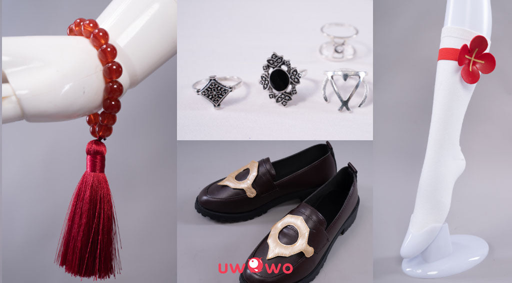 Design by 丽, Uwowo Genshin Impact Hutao Cosplay Costume comes with: a hat, collar, coat, 8 rings, pants, bracelet, socks, sock accessories.