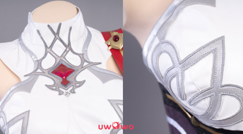 Rosaria Cosplay Costume full set referes to the game within the 3d modeling prevails, the overall fabric using a combination of leather and thick satin digital printing, the exquisite chest type having certain amount of regulation.