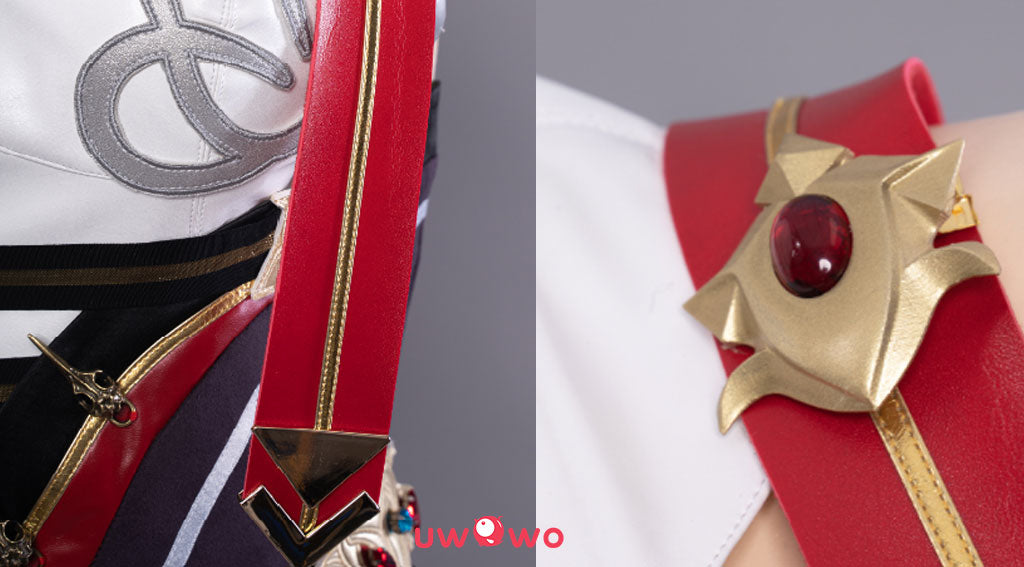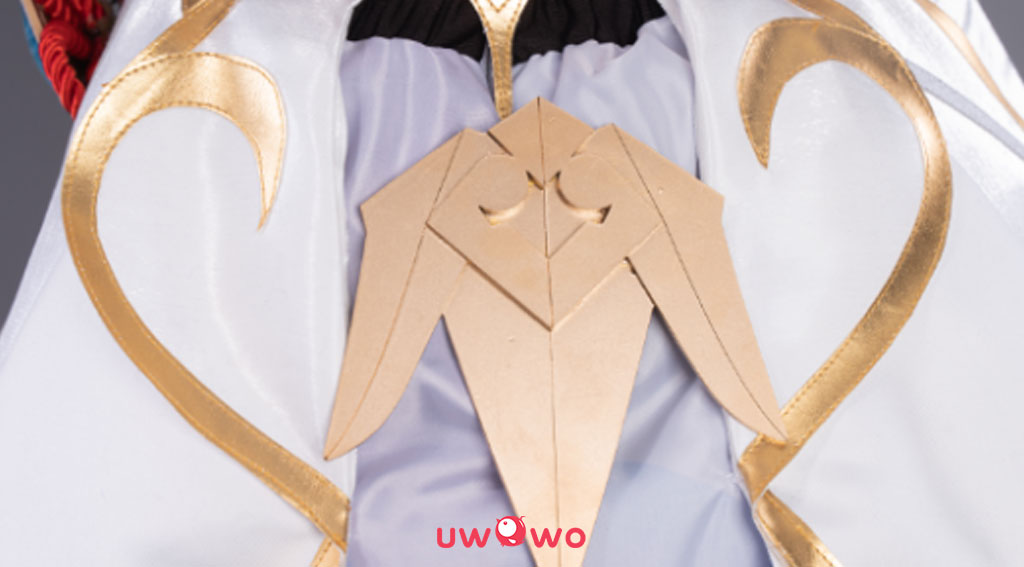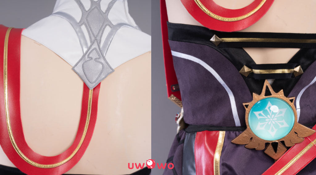 Through 3d modeling, we made her Pyro Vision at the back of her coat. The two sides are embellished with metal pieces of decoration to restore the details of the persona. The back waist rope knot bow adds cuteness for the character. As for the abdominal embroidered flower piece decoration, we used a concealed buckle fixed way, will not affect the front open wearing.