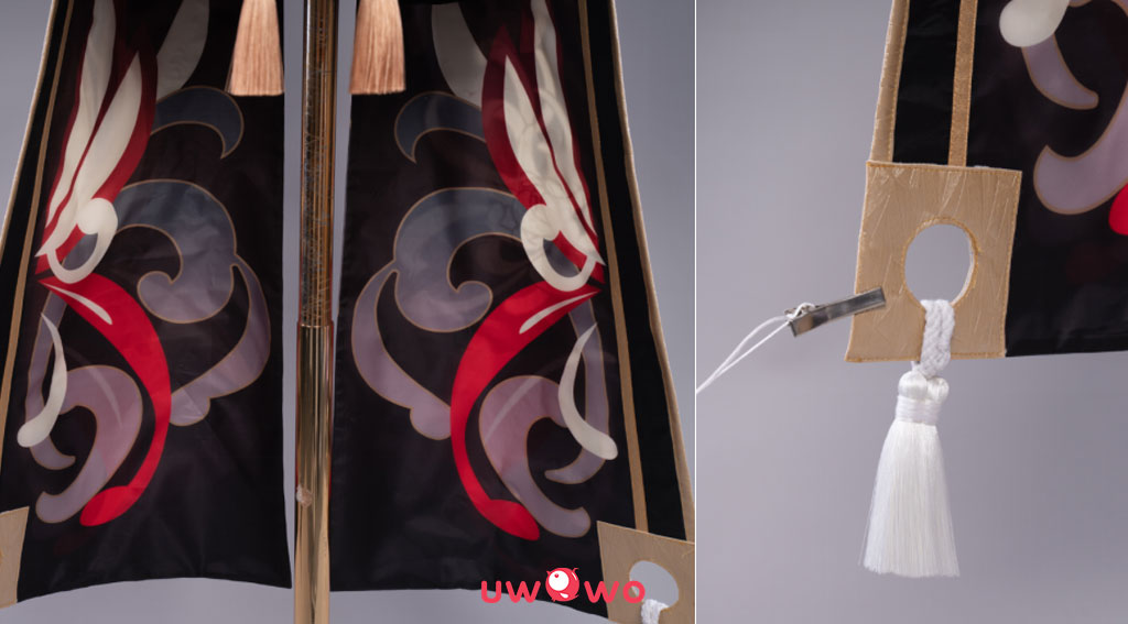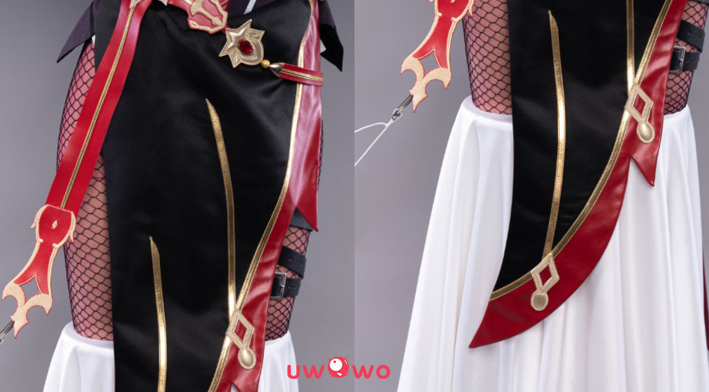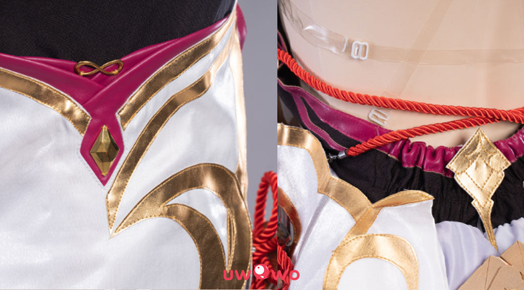 Hutao Cosplay Costume full set refers to 3d modeling in the game, fabric using a combination of peach twill(a higher grade polyester that is cooler to wear. This fabric does not wrinkle easily and is durable) and Korean velvet. We follow the character prototype, carefully drawn the back hem of the print. The overall back shape waist-slimming, back hem can show your long legs.