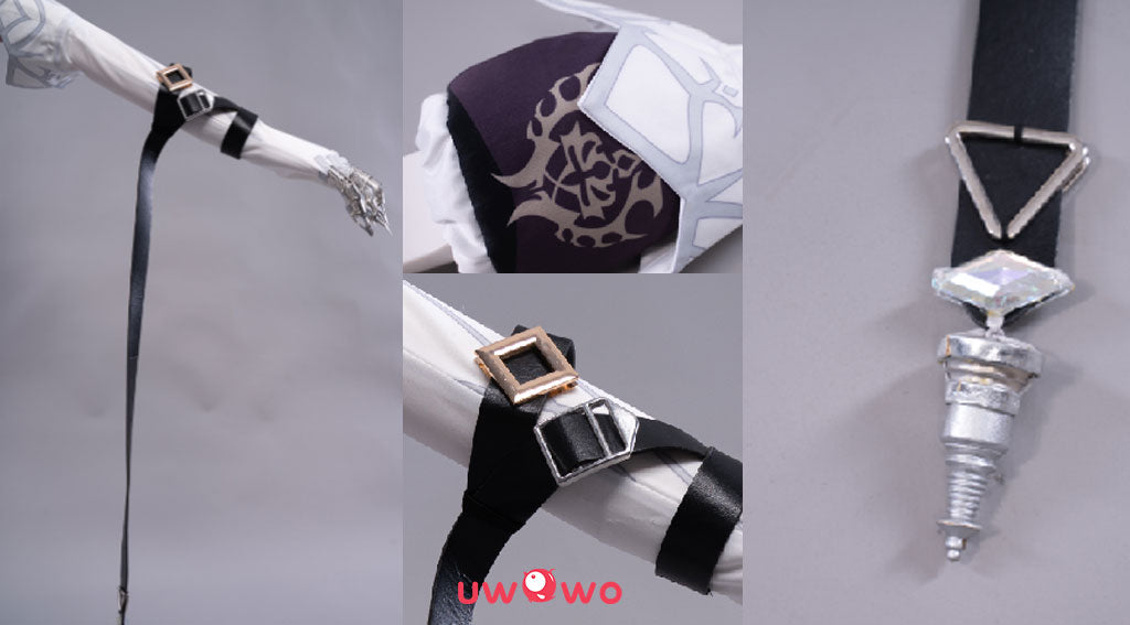 For the gloves, we use this white polyester matte printing with stretchy fabric to fit the arm and rubber bands not easy to slip. We used the shiny leather to make a delicate embroidery chapter with hand sewn fixed. Bright silk nylon twist rope braided four-ring knot with metal lobster buckle closure is easy to wear. Let's check the head accessories, black peach skin velvet cut and fill loose cotton to support the three-dimensional shape.