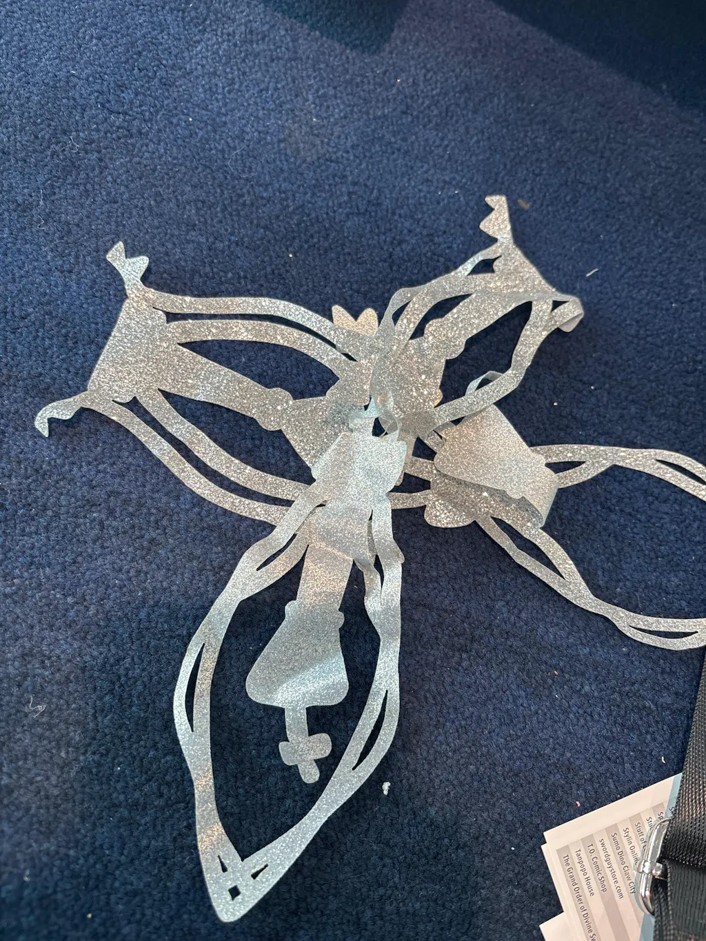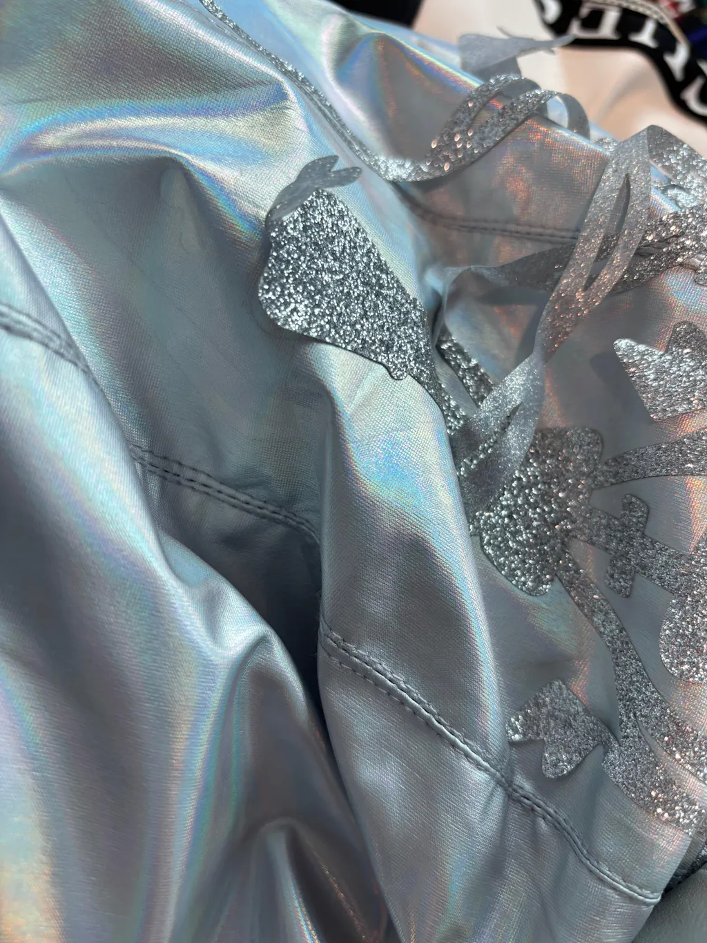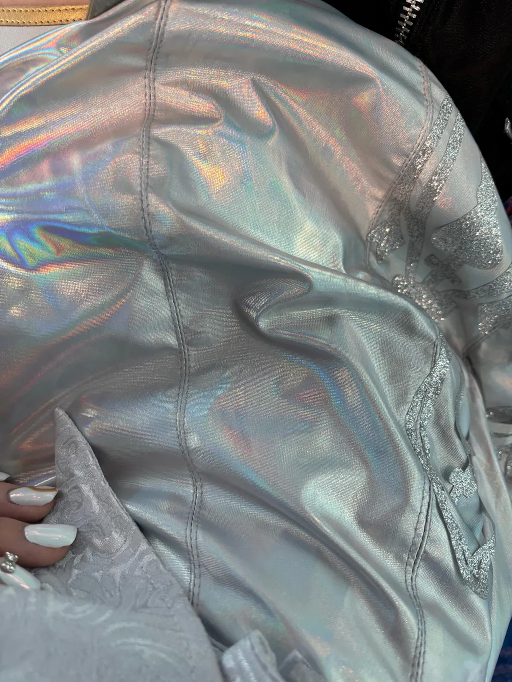 In the first picture this piece was stained. I washed it several times and while faded, is still visible. Next thing to note is the seams on the gloves are very messy and visible. Last issue I've found are these metal pieces, the the green leaves and flowers are attached with glue and is falling apart. The hair pin is also different from the pictures. Overall the only major disappointment is the hair pin.